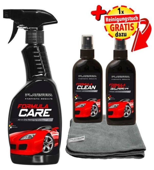Mit Platinum Formula Clean werden hartnäckige Flecken entfernt und wirkt dabei farbauffrischend. Es kann auf glatten Oberflächen, sowie auf den Autositzen angewendet werden.