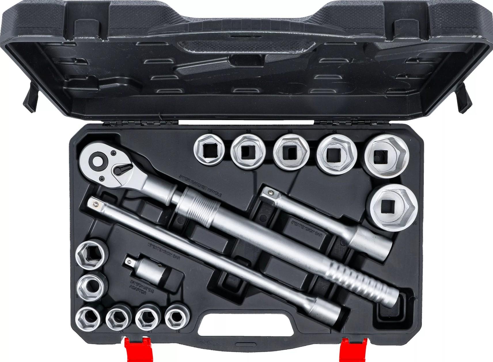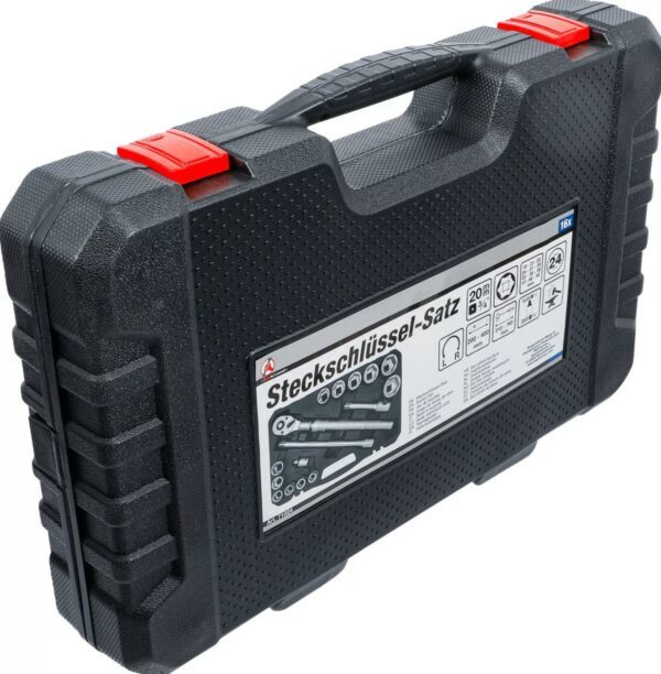 - kompakte Satz-Zusammenstellung mit 12 Steckschlüssel-Einsätzen von 19 – 50 mm, 2 Verlängerungen 200 und 400 mm und einem Steckschlüssel-Adapter von 20 mm (3/4") auf 12,5 mm (1/2")