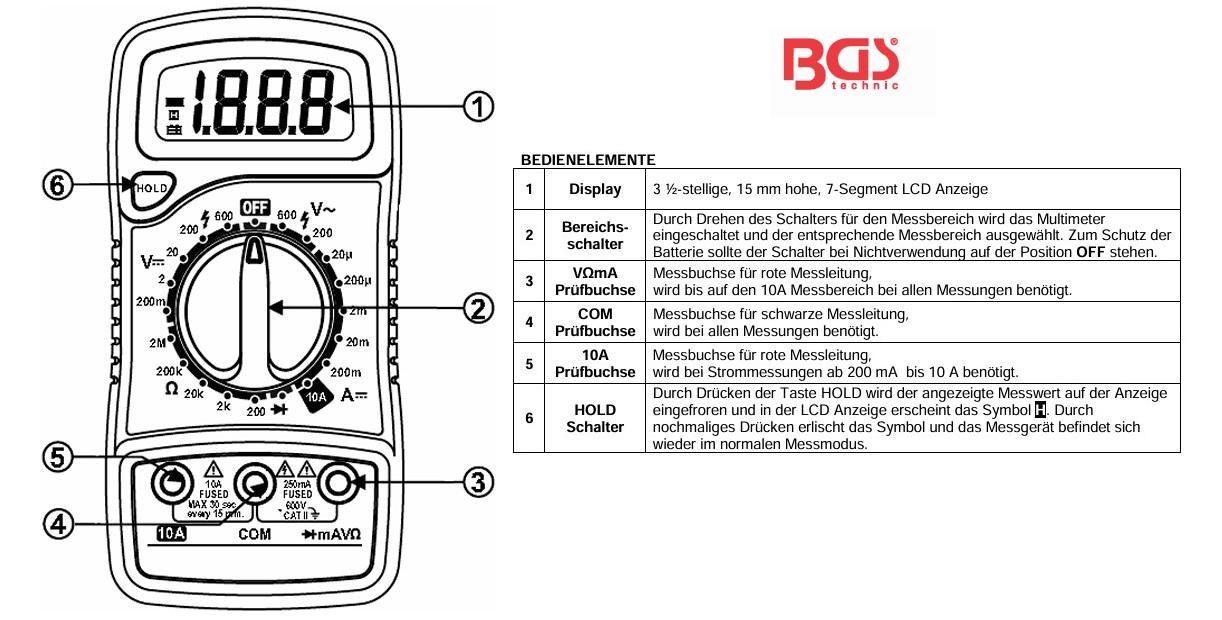 - Gleichstrom 20 µA – 200 µA – 2 mA – 20 mA – 200 mA – 10 A