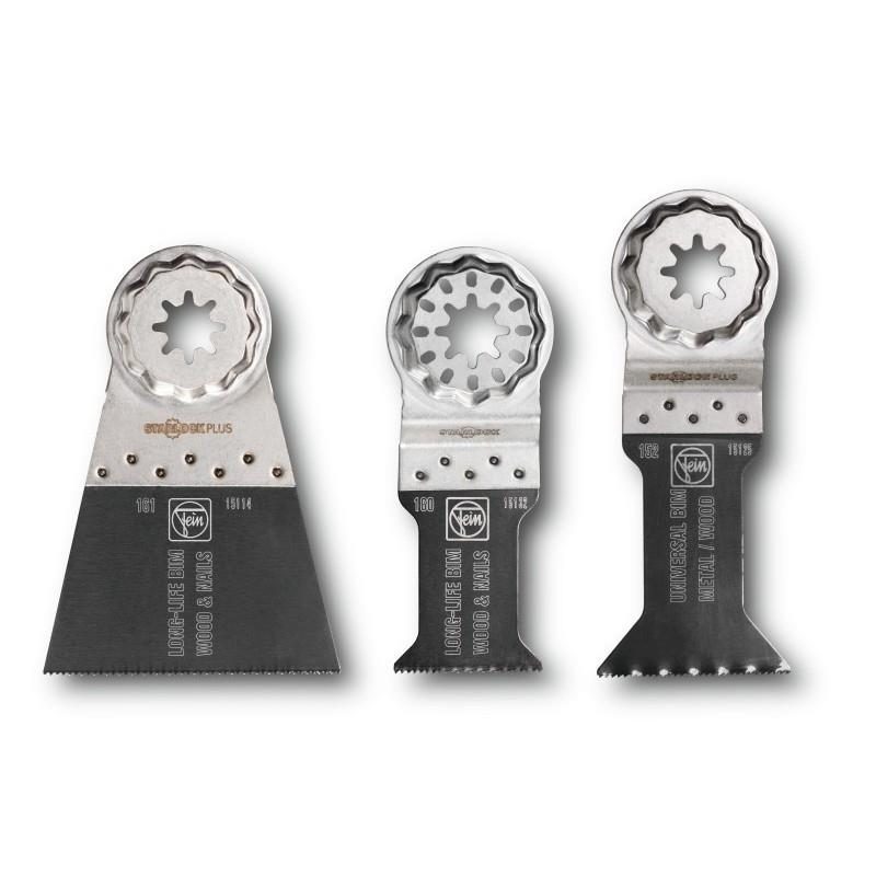 E-Cut Sägeblatt Combo – Zusammenstellung der 3 wichtigsten FEIN E-Cut Sägeblätter für den universellen Einsatz. Preisvorteil gegenüber Einzelbezug. Für alle Säge-Anwendungen perfekt ausgestattet. – Lieferumfang: je 1 E-Cut Long-Life Sägeblatt 35 mm und 65 mm breit und 1 E-Cut Universal-Sägeblatt 44 mm breit