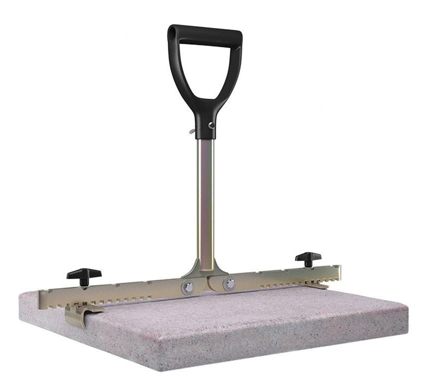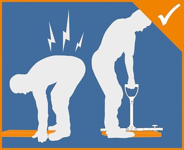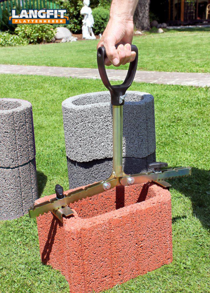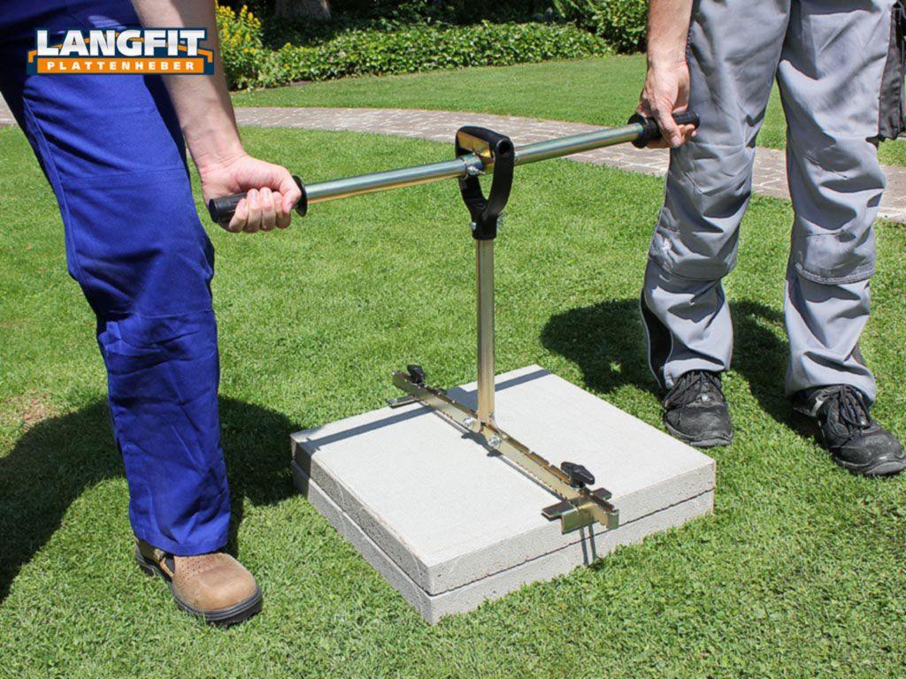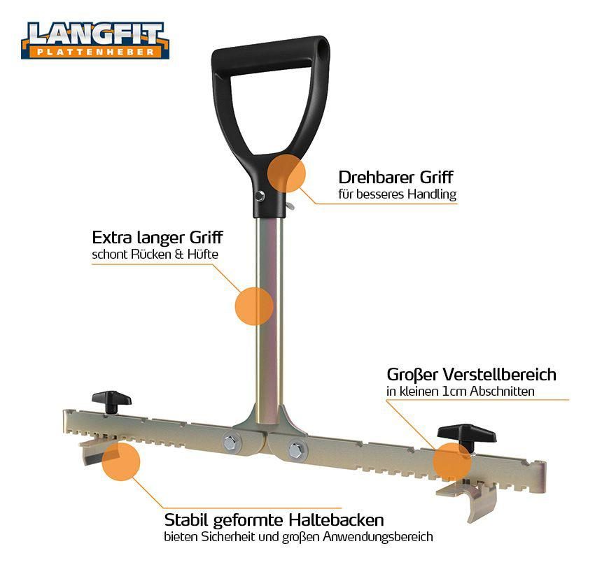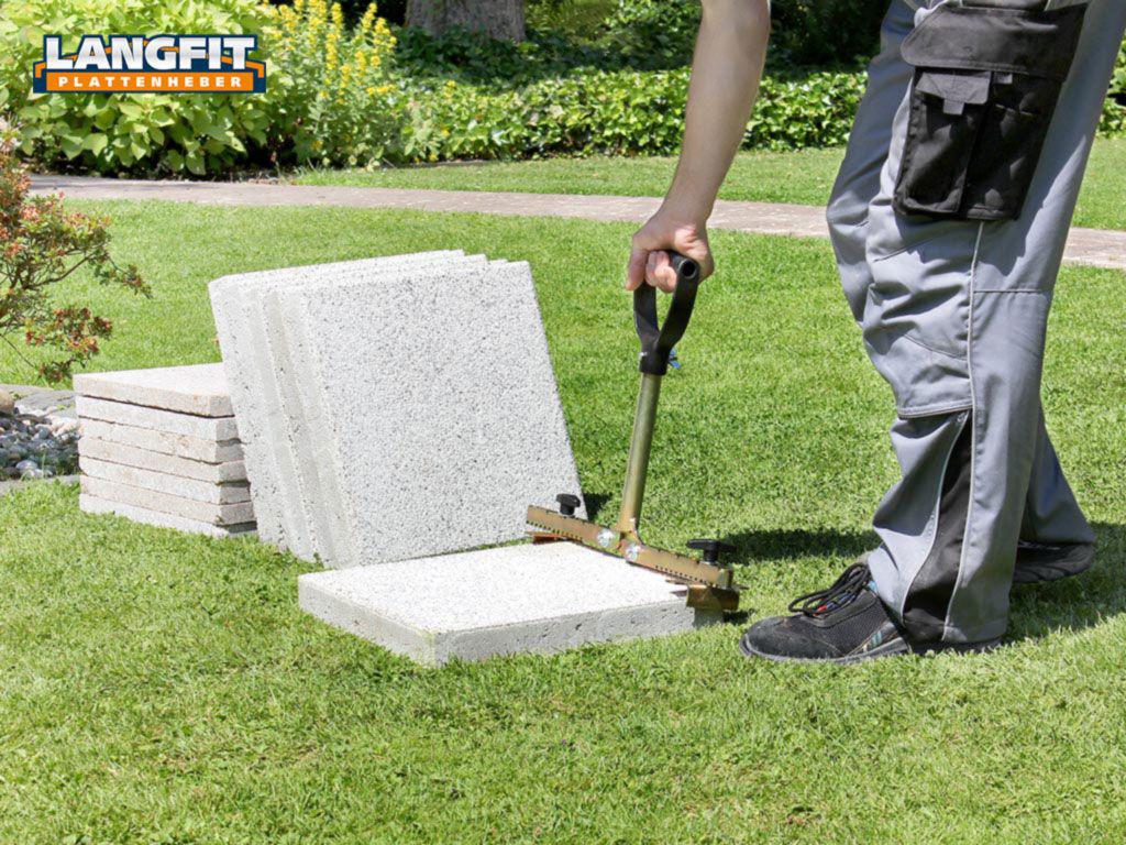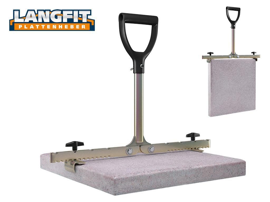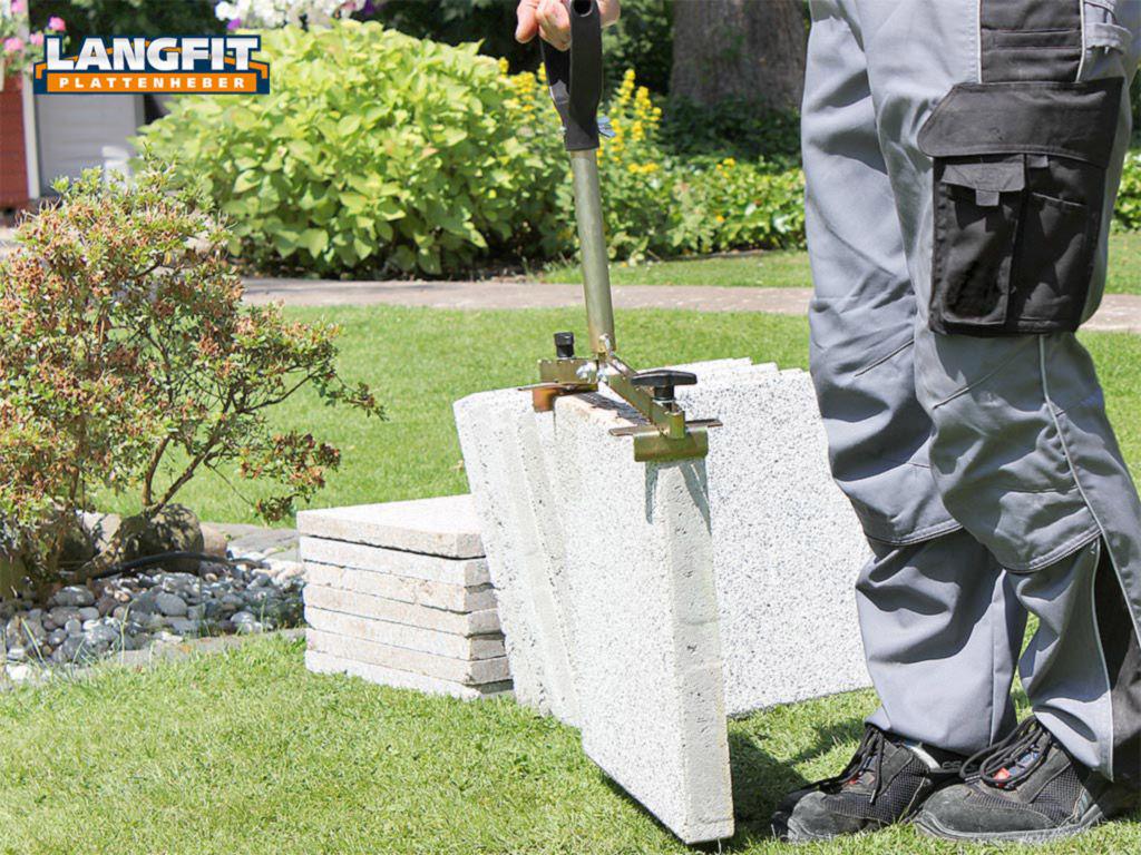 Mit dem LANGFIT Plattenheber können Sie problemlos Gehwegplatten oder Terrassenplatten verlegen, transportieren oder austauschen. Der extra lange, um 90° drehbare Griff schützt Rücken und Hüfte vor zu starker und einseitiger Belastung. Es ist kein tiefes Bücken zum Tragen und Ausrichten der Platten mehr notwendig. Die speziell geformten und äußerst stabilen Haltebacken ermöglichen ein problemloses greifen und anheben der Platte – egal ob senkrecht oder waagerecht!