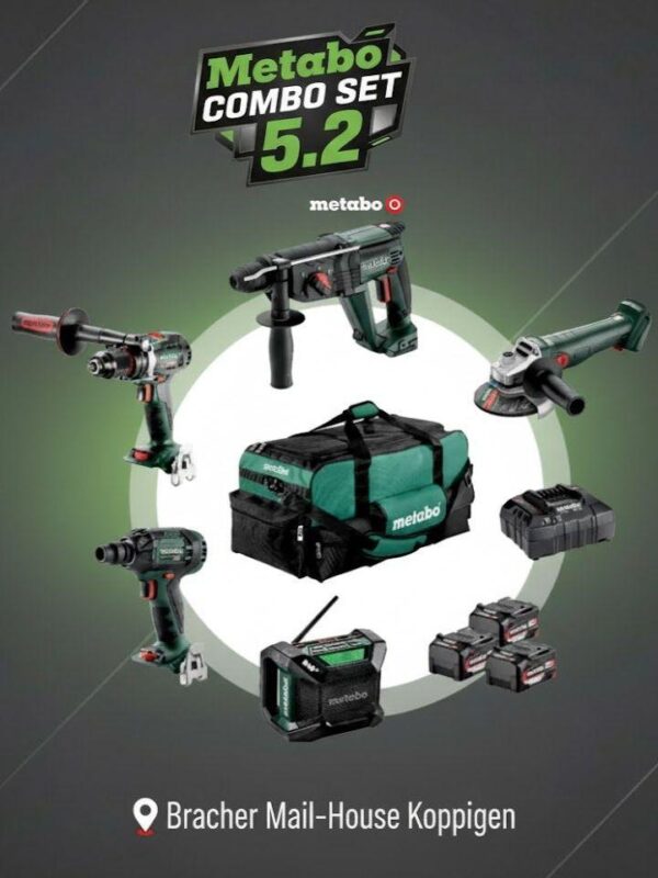 Akku-Schlagbohrschrauber SB 18 LT, Akku-Winkelschleifer W18 L 9-125 Quick, Schnellspannmutter, Schutzhaube, Stützflansch, Zusatzhandgriff, 2 Li-Power Akkupacks (18 V/4,0 Ah), Ladegerät ASC 55, metaBOX 165 L