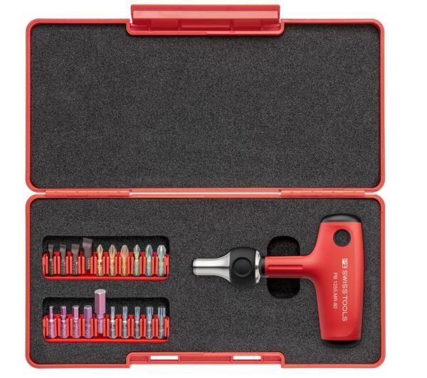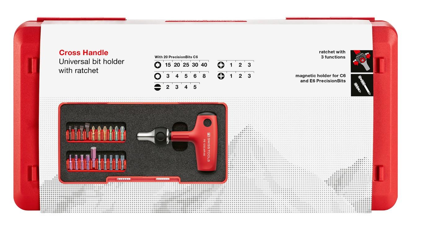 Quergriff – Bithalter mit Ratsche. Set in praktischer ToolBox. Mit 20 PrecisionBits für Schlitz-, Phillips-, Pozidriv-, Torx®- und Innensechskant-Schrauben. Ratsche mit 3 Funktionen, Linkslauf, Rechtslauf und blockierte Stellung.