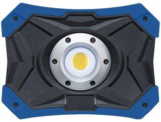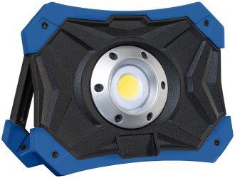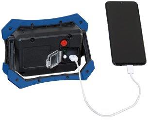 LED-Akku-Strahler mit hocheffizienter COB-LED (1.000 lm, 6.500 K, Ra>80), 3-stufig schaltbar (25 / 50 / 100%), Leuchtdauer max. 10 Stunden, Gehäuse aus robustem Aludruckguss mit weichem Kantenschutz aus thermoplastischem Elastomer, mit verstellbarem Bügel, Ladestandsanzeige, Li-Ion-Akku (4.400 mAh), Powerbank-Funktion, inkl. Micro-USB Ladekabel.