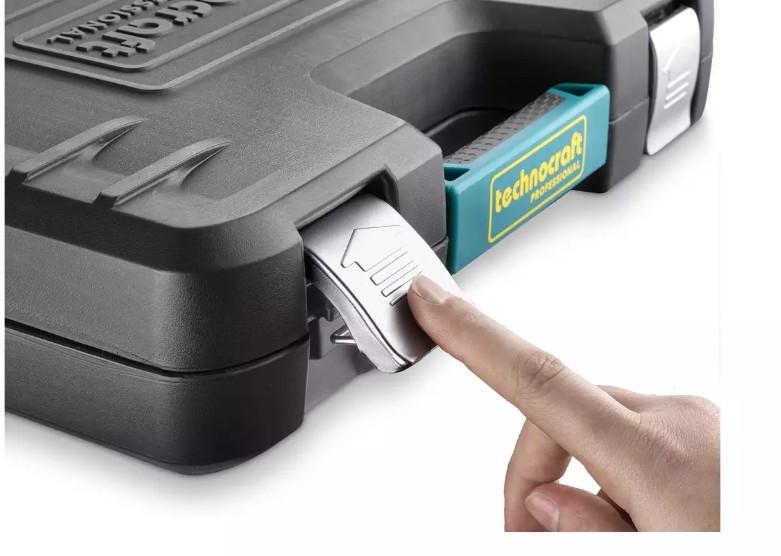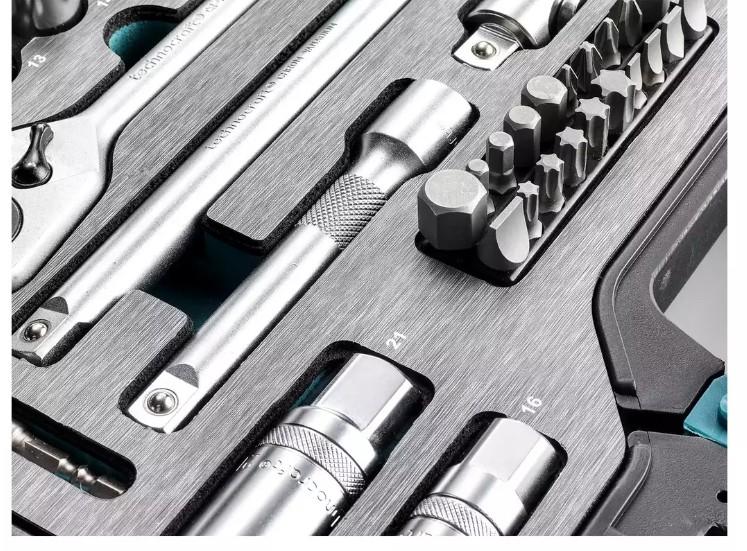 44-teiliger Steckschlüsselsatz in Profi-Qualität für den Einsatz in der Werkstatt und bei der Montage. Die CNC-gefräste Schaumstoffeinlage mit Kunststoffabdeckung bietet jedem Werkzeug seinen Platz und sicheren Halt. Der edle Metall-Finish sorgt für eine einfache Reinigung bei Verschmutzung. Dank dem neuen Verschluss kann der Koffer bequem mit einer Hand geöffnet werden.