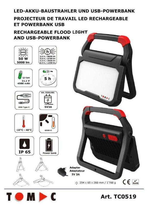 TOMAC LED-Akku-Baustrahler und USB-Powerbank TC0519