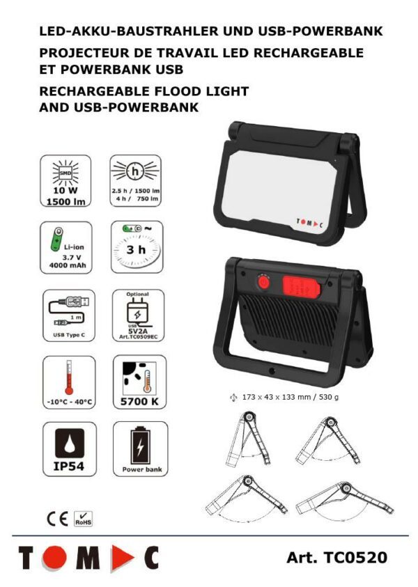 TOMAC LED-Akku-Baustrahler und USB-PowerbankTC0520