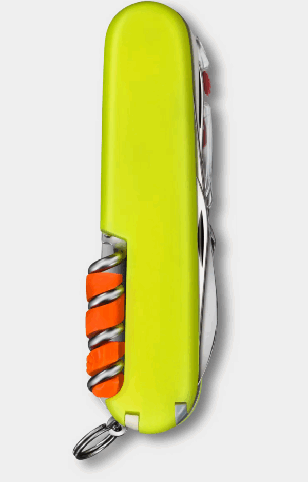 Klinge, gross / Klinge, klein / Korkenzieher / Dosenöffner / Schraubendreher 3 mm / Kapselheber / Schraubendreher 6 mm / Drahtabisolierer / Schraubendreher 2,5 mm / Stech-Bohr-Nähahle / Schere / Holzsäge / Phillips-Schraubendreher 1/2 / Mehrzweckhaken / LED / Ring / Stecknadel / Pinzette / Zahnstocher / Druckkugelschreiber / Feuerstahl / Helix Zunder