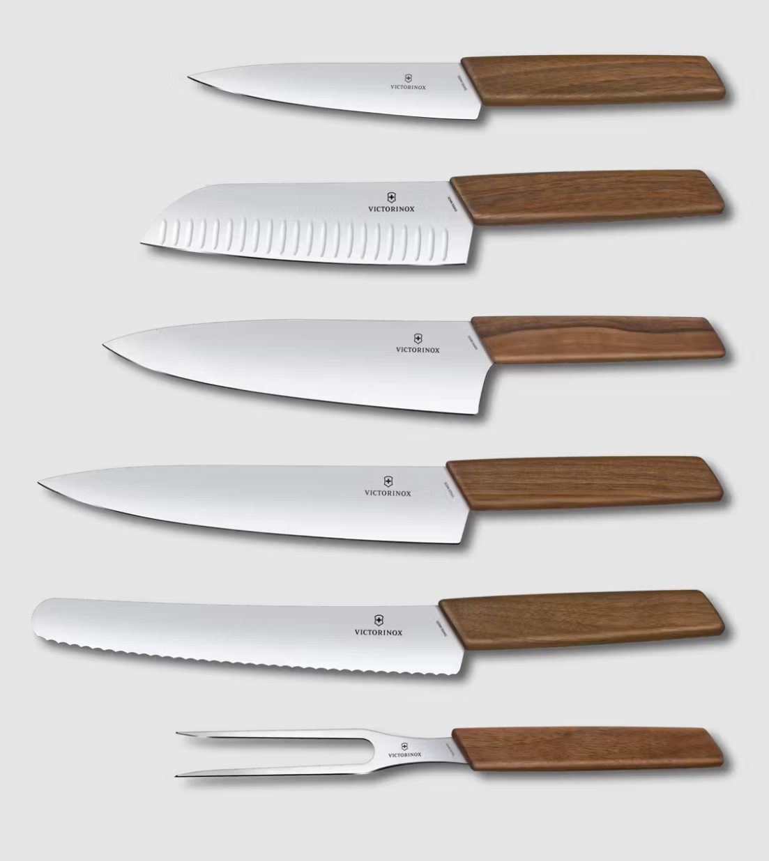 - Alle Messer haben Klingen aus strapazierfähigem rostfreiem Stahl und Nussbaumholzgriffe
