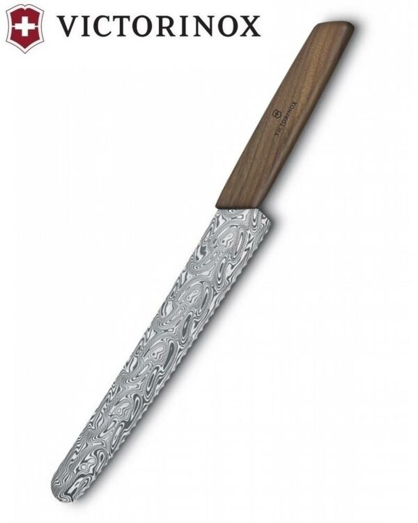 Die Swiss Modern Brot- und Konditormesser Damast Limited Edition 2021 steht für höchste Präzision und vollendetes Design. Das Messer kombiniert eine widerstandsfähige Klinge aus Damaststahl mit einem edel gemaserten Nussbaumholzgriff zu einem einzigartigen Sammlerstück von bleibendem Wert. Das charakteristische Muster auf der Klinge ist eine Hommage an die traditionelle Stahlverarbeitung, die seit über 1.000 Jahren praktiziert wird.