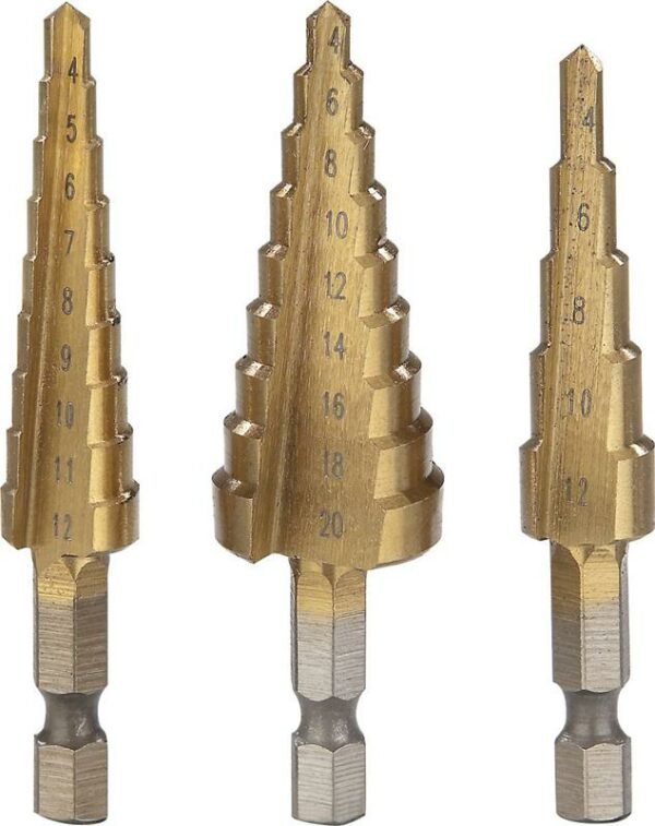 3 x Titan Stufenbohrer HSS4241: 1 x 4 – 12 mm (5 Stufen), 1 x 4 – 12 mm (9 Stufen) und 1 x 4 – 20 mm (9 Stufen) 3 x Titan Fräsbohrer HSS4241: Je 1 x 5 mm / 6 mm / 8 mm1 x Schnellwechsel Bit Adapter